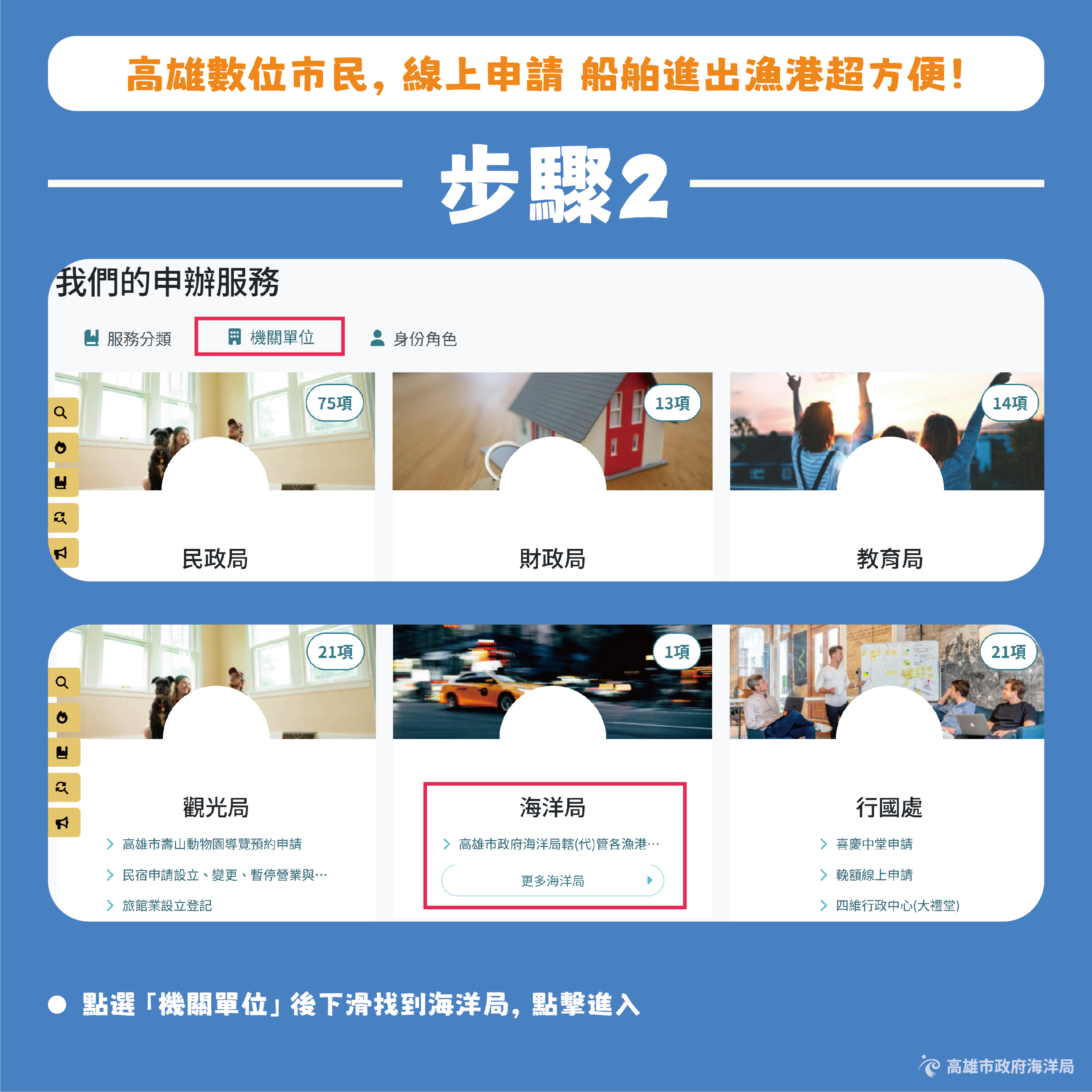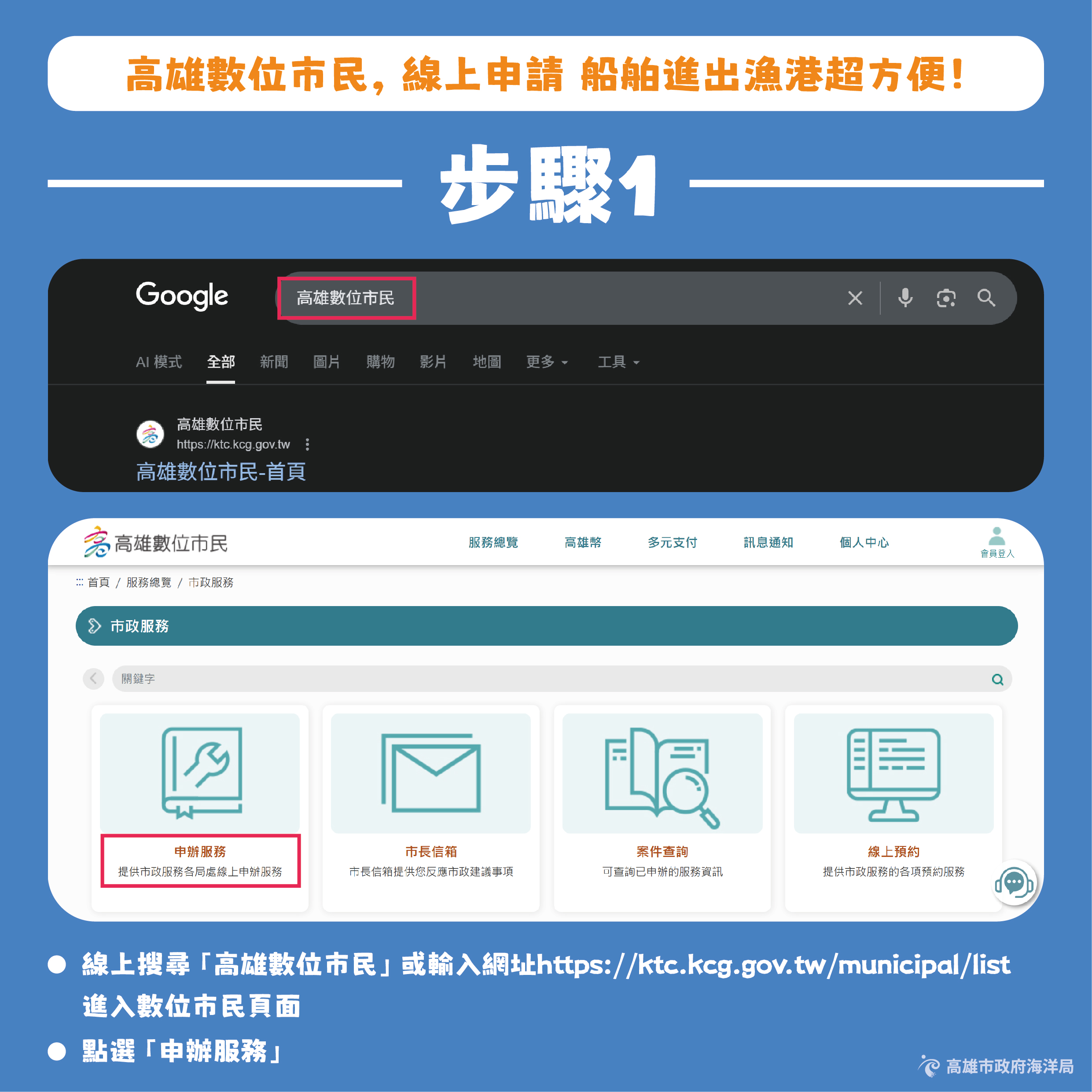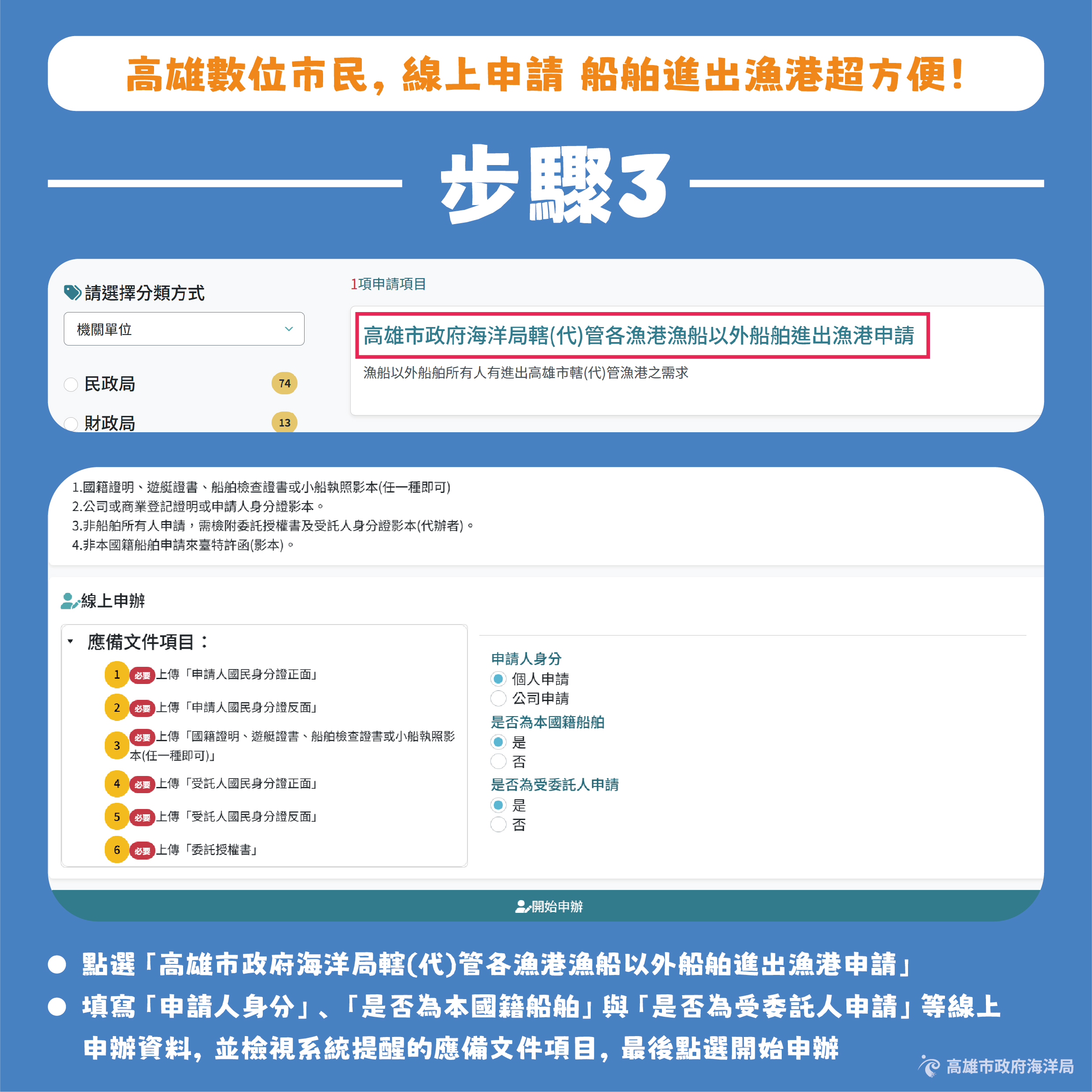 海洋局呼籲,凡屬漁船以外之船舶,進出本市各港口時,請優先透過「高雄數位市民網站」(https://ktc.kcg.gov.tw)路徑:市政服務/申辦服務/機關單位/海洋局/高雄市政府海洋局轄(代)管各漁港漁船以外船舶進出漁港申請,辦理線上申請,共同落實漁港管理數位化,攜手打造高效、便利的漁港環境。
