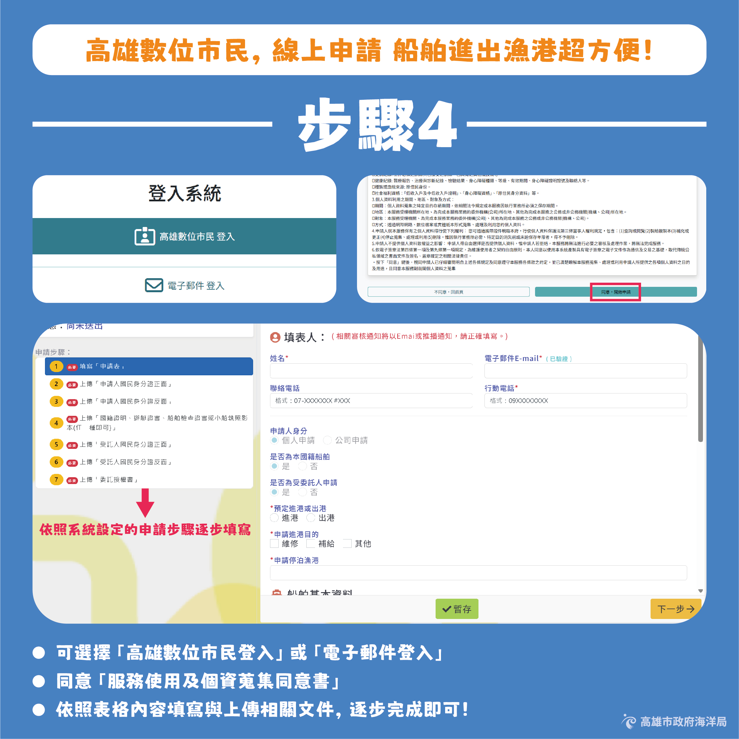 為提升漁港管理效能與為民服務品質,船主、船舶代理人及相關業者可利用高雄數位市民網站,辦理船舶進出港申請作業,以更便捷、高效率的方式完成相關程序。