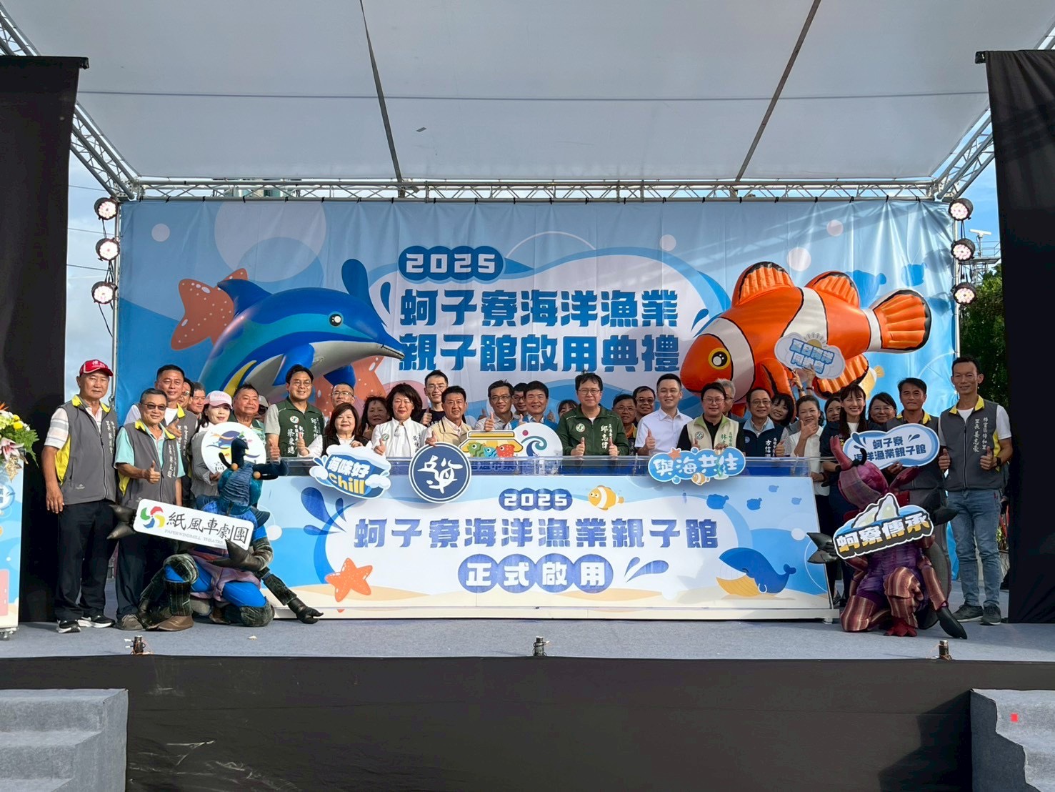 今(9)日「蚵子寮海洋漁業親子館」熱鬧開館,約2,300人參與今日盛會!活動由梓官區幼兒園小朋友帶來活潑的開場表演揭開序幕,緊接著太子舞獅熱情祝賀,現場更匯集25家特色港邊市集,讓人邊逛邊吃停不下來。由海洋委員會補助辦理的海洋保育親子手作課程,也吸引民眾秒殺報名;沉浸式蚵寮文化導覽帶領遊客穿越漁村時光,體驗在地生活韻味。壓軸登場的紙風車劇團,以原創劇碼《巫頂環遊世界》邀大小朋友展開一場奇幻的海底冒險。